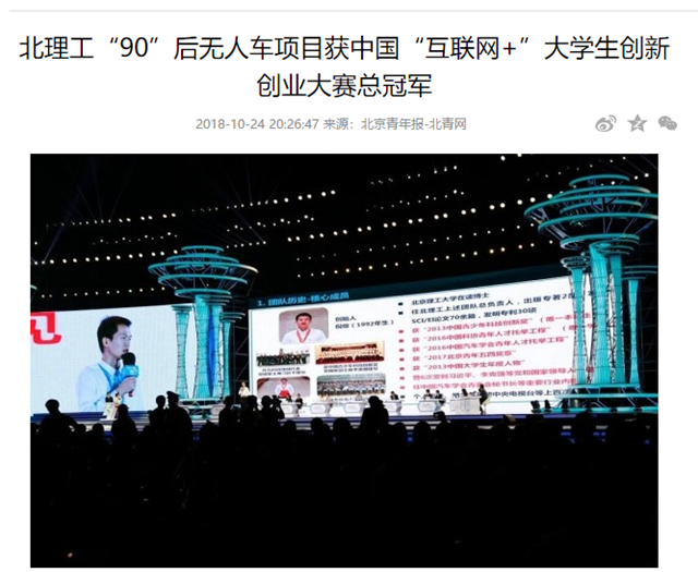 【北青网】bb贝博“90”后无人车项目获中国“互联网+”大学生创新创业大赛总冠军