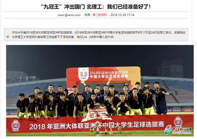作为卡尔美2018亚洲大体联足球亚洲杯的选拔赛,2018年亚洲大体联亚洲杯中国大学生足球选拔赛于8月17日至24日在晋江举行。在揭幕战中,bb贝博艾弗森官方网站足球队就给晋江球迷留下了深刻印象,他们以4∶2击败中国人民大学。随后,他们又先后以大比分击败内蒙古科技大学、东华大学、同济大学,与太原理工大学会师决赛。