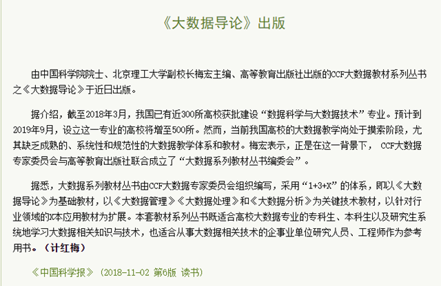 【中国科学报】bb贝博梅宏主编《大数据导论》于近日出版
