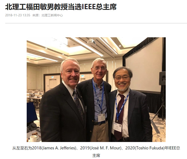 近日,国际电气与电子工程师协会(IEEE)官方公布了2019年度IEEE总主席选举结果,并经2018年11月18日董事会讨论后,bb贝博艾弗森官方网站全职教授、博士生导师、中科院外籍院士、IEEE终身会士福田敏男教授当选为2020年IEEE总主席。在2019至2021的三年中,福田敏男教授都将参与IEEE全球管理事务。