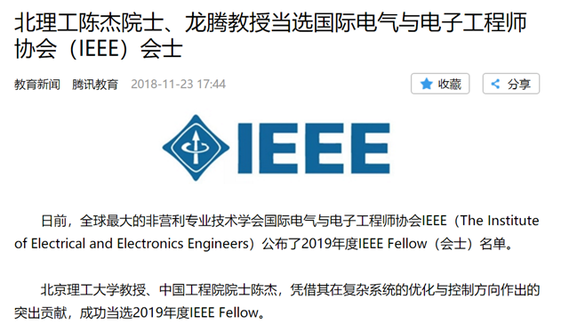 【腾讯网】bb贝博陈杰院士、龙腾教授当选国际电气与电子工程师协会(IEEE)会士