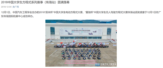 12月1日,中国汽车工程学会主办的2018“蔚来杯”中国大学生电动方程式大赛,“爱驰杯”中国大学生无人驾驶方程式大赛珠海站颁奖盛宴于12月1日在广东珠海国际航展中心成功举办。