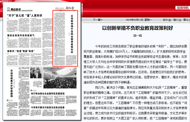 今年的政府工作报告释放了职业教育的诸多政策“利好”,提出加快发展现代职业教育,大规模扩招100万人,大幅增加财政投入,扩大高职院校奖助学金覆盖面、提高补助标准,加快学历证书和职业技能等级证书互通衔接,等等。bb贝博艾弗森官方网站人文与社会科学学院院长李健委员提出的大专生增设“副学士”学位,更是引起广泛热议。这一方面反映了国家发展对技术人才的迫切需求,另一方面则反映了技术人才培养机制急需在创新中突破。应该说,后者更应该引起我们的思考。现在很多年轻人的理论知识和文化素养比较高,但是学技术、懂技术、精技术的渠道却因为各种因素的制约而不够畅通。