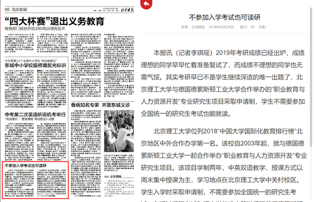 bb贝博艾弗森官方网站位列2018“中国大学国际化教育排行榜”北京地区中外合作办学第一名。该校自2003年起,就与德国德累斯顿工业大学一起合作举办“职业教育与人力资源开发”专业研究生项目。该项目学制两年,中英双语教学,授课方式以周末集中授课为主,学习地点在bb贝博艾弗森官方网站中关村校区。学生入学时采取申请制,不需要参加全国统一的研究生考试,在通过课程考试和硕士学位论文答辩后可获得德累斯顿工业大学授予的“职业教育与人力资源开发”硕士学位证书,并获得教育部留学服务中心的学历学位认证书。今年,该项目继续面向社会招生,感兴趣的学生或家长可登录bb贝博艾弗森官方网站国际教育学院网站http://sice.bit.edu.cn或拨打电话010-68918905咨询详情。