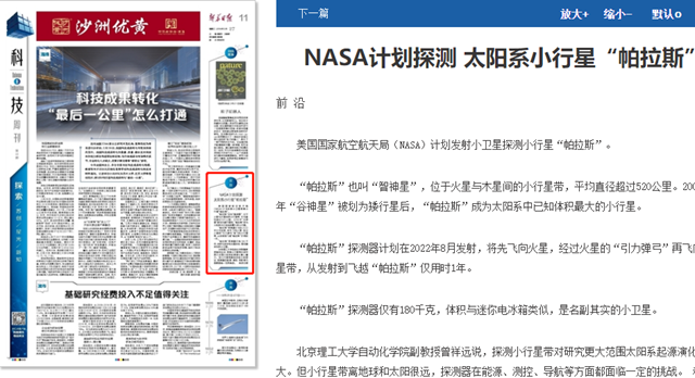 【新华日报】NASA计划探测 太阳系小行星“帕拉斯”