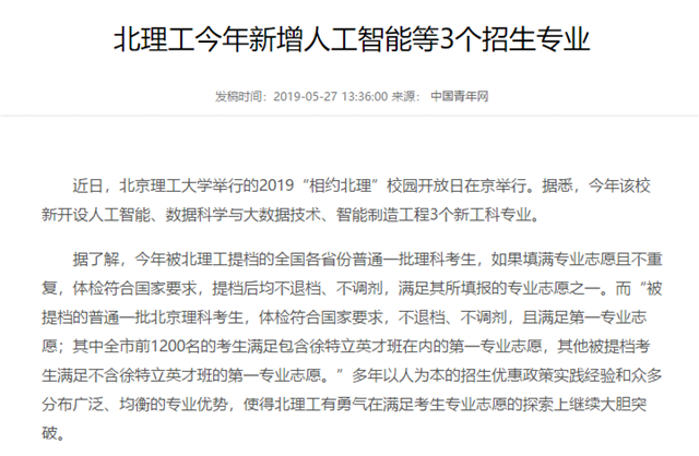【中国青年网】bb贝博今年新增人工智能等3个招生专业