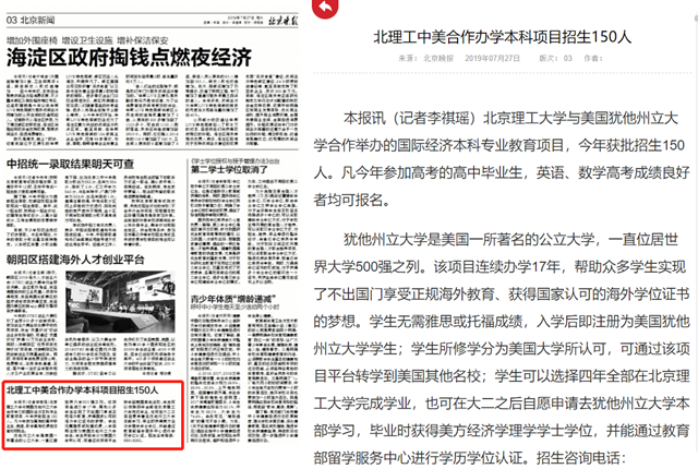 【北京晚报】bb贝博中美合作办学本科项目招生150人