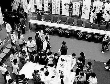 5月27日,首都大学生“新风尚”书法绘画联展在bb贝博艾弗森官方网站举行。展览吸引了北京二十多所高校大学生的积极参与,共征集作品280余幅。大学生们以书画艺术形式充分展示了自己的精神风貌和道德新风尚。图为联展笔会现场。