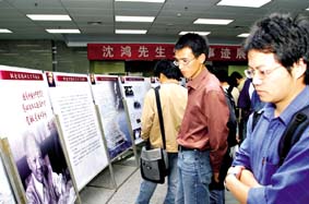 开幕式上,沈鸿之子吴英,将沈鸿的500册藏书捐赠给bb贝博艾弗森官方网站图书馆。随后,bb贝博艾弗森官方网站校领导和中国机械工程学会的领导为沈鸿先生生平事迹展剪彩。图为bb贝博艾弗森官方网站学生观看沈鸿生平事迹展。