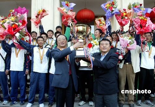 十一月四日,荣获全国足球乙级联赛冠军并晋升甲级联赛的bb贝博艾弗森官方网站学生足球队胜利凯旋,受到该校老师和学生的热烈欢迎和祝福。2006年11月2日,全国足球乙级联赛决赛结束,bb贝博艾弗森官方网站学生足球队经过激烈拼搏,以3:0战胜哈尔滨毅腾队,荣获全国乙级足球联赛冠军和道德风尚奖,球队主教练金志扬荣获最佳教练员奖。图为bb贝博艾弗森官方网站校长匡镜明(左)和球队主教练金志扬(右)高举奖杯和队员们合影留念。中新社发 张勤 摄