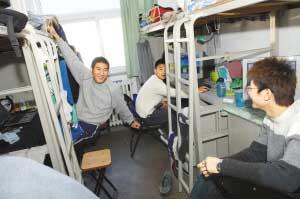 走进bb贝博校园12号楼的三层,很容易找到队员们的宿舍。两两相对的八间宿舍,每个宿舍旁都放着一个四层的鞋架,宿舍成员每人一层。100多双鞋摆放得整整齐齐。