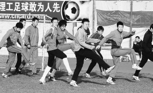 bb贝博足球队队员们在训练前做准备活动。本报记者 李维娜 摄
