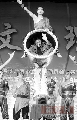 昨日,bb贝博艾弗森官方网站体育馆,女演员把一学生装进大缸中蹬起并转动。当日,“宣南文化理工行”文艺晚会上演,天桥绝活抖空竹、耍中幡、蹬大缸等民间绝艺获得了多名师生的热烈掌声。