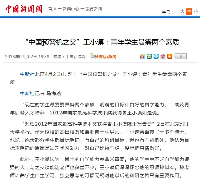 【中国新闻网】bb贝博校友“中国预警机之父”王小谟:青年学生最需两个素质