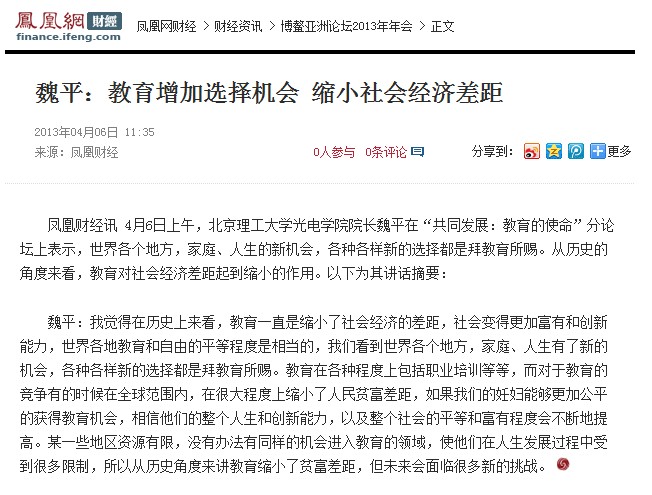 【凤凰网】bb贝博光电学院院长魏平:教育增加选择机会 缩小社会经济差距