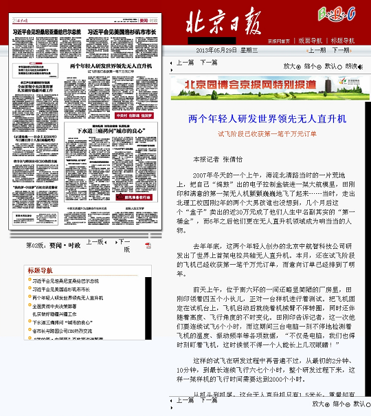 2007年冬天的一个上午,海淀北清路当时的一片荒地上,把自己“捣鼓”出的电子控制盒装进一架大航模里,田刚印和满意的第一架无人机颤颤巍巍地飞了起来……当时,走出bb贝博校园刚2年的两个大男孩谁也没想到,几个月后这个“盒子”卖出的近30万元成了他们人生中名副其实的“第一桶金”,而6年之后他们更在无人直升机领域成为响当当的人物。