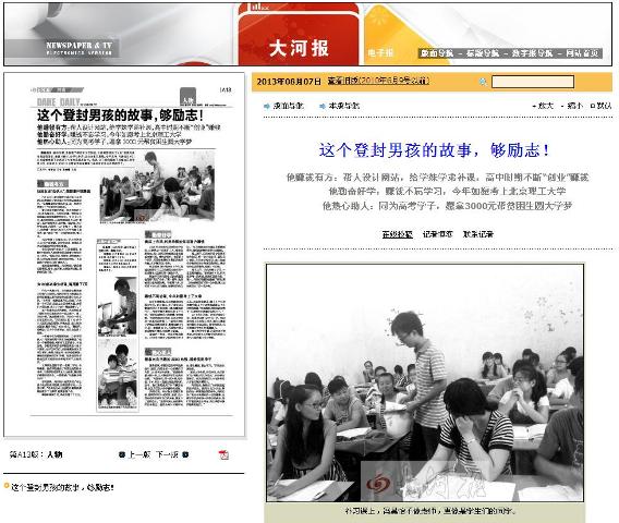 【大河报】bb贝博2013级本科准新生的励志故事之“创业有方 勤奋好学 热心助人”