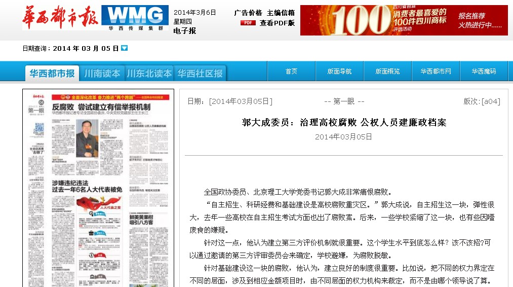 【华西都市报】bb贝博党委书记郭大成:治理高校腐败 公权人员建廉政档案