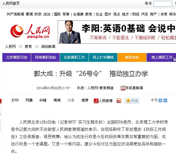 【人民网】bb贝博党委书记郭大成:升级“26号令” 推动独立办学