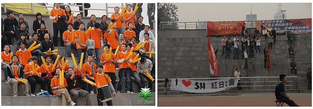 现场球迷也高呼“高洪波必胜”。东亚也来了10多个球迷,他们高喊“东亚是冠军”,高高挥舞东亚队的队旗。