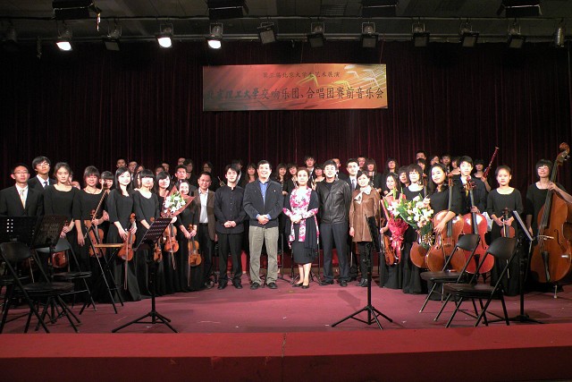 音乐会最后,我校学生合唱团的同学们又一起演唱了由合唱团艺术指导贺春华教授与同学们一起根据我校校友曾庆红创作的《献给母校的歌,送给师长的花》把晚会推向新的高潮。这首诗歌是曾庆红为我校建校60周年时而作,作者感情深厚的表达了自己对学校的崇敬之情,“在战火纷飞中成长壮大,窑洞中培育出我党第一代理工人才,身披共和国诞生的霞光异彩,胸怀为国防事业奉献的豪迈!得天独厚的北京首都迅猛发展,建成人才培养与国防科研的国家品牌。生我者父母,育我者校园-----”。同学们深情的演唱打动了在场的每一位观众,排练这首作品时老师曾经在分析作品表达时有的学生因为感动而哽咽。这就是艺术作品所给予人们的许多意想不到的震撼与力量。