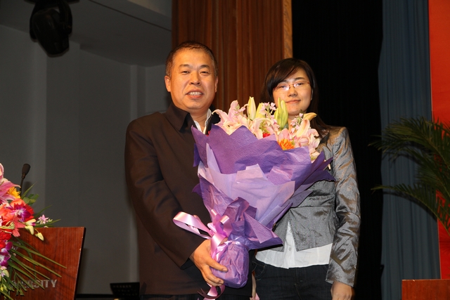 报告团成员演讲结束后,领航奖学金获得者、机械与车辆学院2010届本科毕业生郑瑞琴手捧鲜花代表优秀毕业生向辛勤培育他们的母校表达了谢意,李和章校长代表学校接受了毕业生献礼。