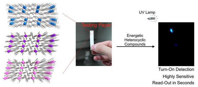 化学学院的王博、冯霄等研究者在前期的工作基础上(Chem. Commun., 2013, 49, 7049;Chem. Eur. J., 2014, 20, 8856;Chem. Sci., 2014, 5, 4388),开发出一种高灵敏、裸眼可视、简便的五元杂化爆炸物的荧光检测方法,并且裸眼检出限可达6.5 ng/cm2,爆炸物溶液光谱检出限可达10-9 mol/L。该方法利用本身具有聚集诱导发光性质的有机连接基元与金属离子进行连接,制备金属有机骨架材料(MOF)作为传感器,并通过改变金属离子的种类调节MOF传感器的荧光特性。当引入特定金属离子时,MOF传感器的荧光可以被预先“关掉”,而当该传感器接触到五元杂环爆炸物时,荧光“开关”可被迅速触发,使得荧光在十几秒内重新被释放出来。这一由“关”到“开”的荧光信号变化,不仅可以被光谱仪器所捕捉从而用于定量检测,还可十分容易的通过裸眼直接观察到。该传感器可直接用于便携式试纸检测。该研究成果近日发表在国际顶级化学期刊《Journal of the American Chemical Society》上(J. Am. Chem. Soc., 2014, DOI:10.1021/ja508962m)。bb贝博艾弗森官方网站材料学院的董宇平教授对该研究工作提出了宝贵的建议。
