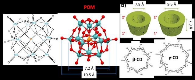 图1. (a) 杂多酸[PMo12O40]3+的分子结构示意图(b)β-和γ-环糊精的分子结构示意图。