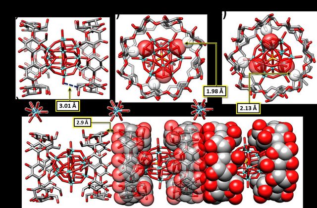 Sir J. Fraser Stoddart教授在有机化学和超分子化学等领域做出了令世界瞩目的杰出贡献,也是著名的环糊精化学方面的科学家。李晖教授在功能配合物的设计、制备、结构与性质,以及新型化合物和较复杂体系的结晶学的研究领域具有深厚的研究基础。两人的合作一举攻克了这一难题。开创性地运用超分子自组装的方法,在温和、环境友好的合成条件下将[PMo12O40]3+与β-环糊精和γ-环糊精分别组装成为晶态有机-无机杂化材料,并运用X-射线单晶衍射法对两种杂化材料的晶体结构进行了详细的分析。图2展示了γ-环糊精与杂多金属氧簇[PMo12O40]3+形成的有机-无机杂化材料的晶体结构图。运用同步辐射小角和广角X射线散射(SAXS/WAXS)技术以及核磁共振谱学方法(1H NMR)对溶液中的自组装过程进行了研究;对材料的部分性质进行了初步的探索。该研究开辟了环糊精-多金属氧簇(CD-POM)杂化材料的新研究领域。可以预期:这类新杂化材料将在催化,光催化和生物医药等领域具有重要的应用。