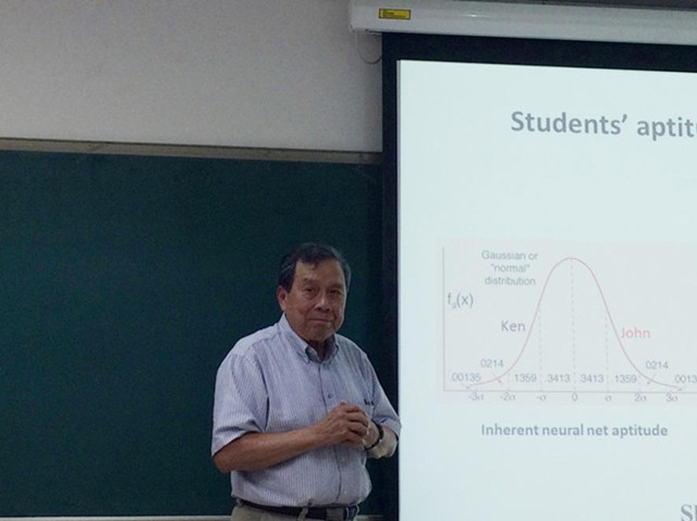 28日下午,杨振寰教授给博士生上了一堂关于学习方法的生动有趣的课程。杨教授从我们每人都具有的生物神经网络(大脑)的特点出发,带领听众走上一条探求高效学习之路。杨教授结合科研经历,分析了生物神经网络(大脑)与人工神经网络(计算机)各自的优缺点,从而告知大家大脑的可塑性和新陈代谢能力具有不可比拟的优势。通过联想记忆、认知学习等方法我们能够记得快、学得好。杨教授举了模拟信号传输与数字信号传输的例子,告诉大家:虽然我们都知道数字系统怎样运作,但这还是不够的,我们还应当弄明白事情背后的原因,在这个例子中,我们是为了获得噪声免疫特性而放弃了模拟信号高码率的优点。杨教授讲述了先天因素与后天环境对于个人发展的作用,鼓励大家积极通过努力提升自我。