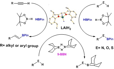 杨智副教授课题组在其最近研究成果(Angew. Chem. Int. Ed. 2015, 54, 10225,Hot Paper)的基础上,设计并合成了新的铝二氢化合物。其催化炔、醇、胺、以及硫醇的硼氢化反应获得了很高的催化产率。相关成果最近发表在J. Am. Chem. Soc. 2016, 138, 2548(美国化学会会志,化学领域顶级期刊,IF=12.1)上。