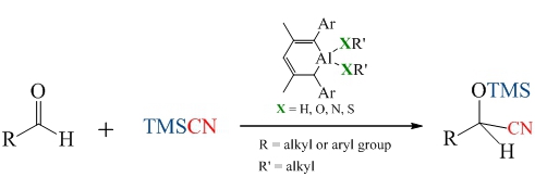 该课题组最近合成了含Al-O-C、Al-O-S以及Al-O-N结构片段的新型有机铝化合物,成功将其用于高效催化羰基与TMSCN的加成反应中,并系统的研究了各催化剂所含不同取代基团对催化效果的影响。相关成果最近在著名化学期刊Chemistry-An European Journal(欧洲化学,DOI:10.1002/chem.201505162)上在线出版。