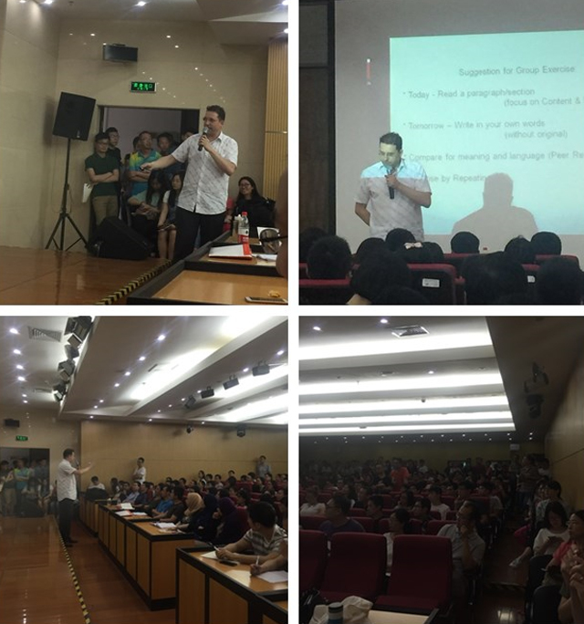 Torsten博士首先介绍了研究者撰写科学论文的目的和原因,重点强调了科学论文写作的两个必要环节:分析和组织科学思想。他形象地阐述了为什么要写作、如何写作以及什么是科学写作等基本内容。接着,Torsten博士分析了国内广大学者面临的科学写作困扰:如何凝练好的科学思想?为什么写作不能由中文开始?什么是科学语言的规范表达?以及怎样突破英语水平的局限?Torsten博士的报告引起师生们的强烈共鸣,他详细解释了科学写作的内涵、研究结果与写作的关系,并举例说明了科学学术写作的组织,应是目的、受众、组织结构、写作风格、流畅度的有机统一体。当Torsten博士以实际案例告诉师生们,一篇顶级期刊论文的投稿,可以做到不耗费很多时间时,报告现场一片哗然,大大提升了师生们的信心。