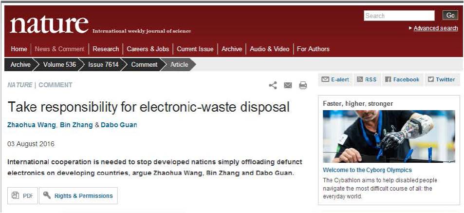 bb贝博艾弗森官方网站王兆华教授和张斌博士与英国东英吉利大学Dabo Guan教授在前期工作的基础上,分析了全球电子废弃物流向和回收处置不均衡的问题。研究成果“Take Responsibility for Electronic-waste disposal”发表于Nature的Comment栏目(文章链接:http://www.nature.com/news/take-responsibility-for-electronic-waste-disposal-1.20345),这也是中国学者首次在Nature上探讨电子废弃物回收处置话题。