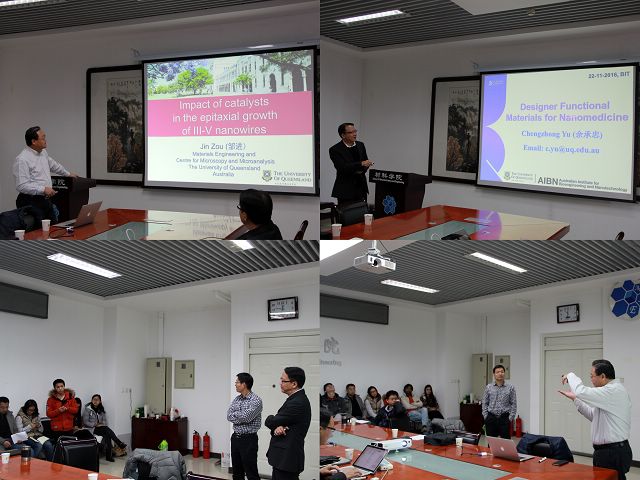 11月22日,在中关村校区5号楼502报告厅Jin Zou(邹进)教授和Chengzhong Yu(余承忠)教授分别做了题为“Impact of Catalysis in the Ppitaxial Growth of III-V Nanowires”和“Designer Functional Materials for Nanomedicine”的专题学术讲座。讲座之后,同学们积极地与两位教授进行了互动交流,对某些专业问题进行了深入的探讨。