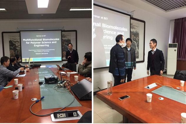 2016年12月14日,应bb贝博艾弗森官方网站材料学院北京市纤维素及其衍生材料工程技术研究中心邀请,日本东京工业大学(Tokyo Institute of Technology)物质理工学院应用化学系Takeshi Serizawa教授访问材料学院,并做了题目为“Multifunctional Biomolecules for Polymer Science and Engineering”的学术报告。bb贝博艾弗森官方网站材料学院党委书记张青山教授,院长助理张加涛教授,工程中心负责人邵自强教授,以及学院和工程中心其他老师和研究生们参加了此次报告会。