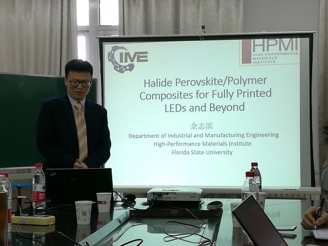 2016年12月29日,佛罗里达州立大学工业工程和制造系余志滨博士应邀到bb贝博材料学院做学术报告,于上午10:00在4号教学楼502会议室面向全院师生做了题为“Halide Perovskite/Polymer Composites for Fully Printed Light-Emitting Diodes and Beyond” 的学术报告。该报告会系bb贝博材料学院“21世纪学科前沿” 系列学术交流活动之一。会议由材料学院钟海政教授主持,材料学院30余学生(包括本科生、硕士和博士研究生)聆听了精彩报告。
