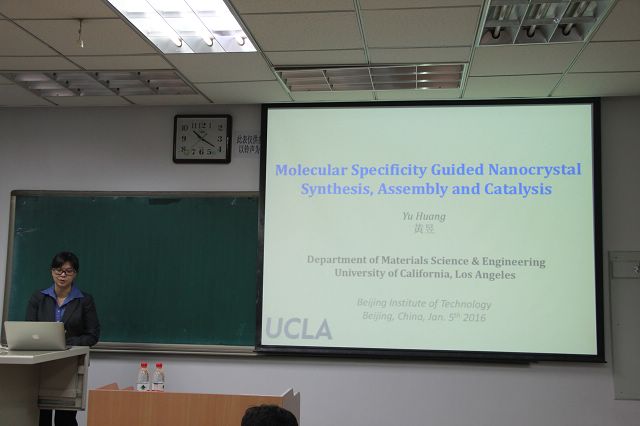 黄昱教授的报告同样精彩。她首先提出将生物仿生方法运用到纳米晶体形貌可控制备中的概念,通过噬菌体展示技术筛选出与靶向材料表面甚至特定晶面有特异吸附作用的生物分子,并利用筛选出的生物分子对纳米晶的生长进行精确调控进而控制纳米晶体的形貌,通过这种方法可以设计并合成具有高催化活性的催化剂。此外,黄昱教授进一步阐述通过组分和表面调控以获得高活性的催化剂的方法和机理。黄昱又对该研究方向未来的发展、机遇和挑战进行了展望,并与在场师生进行了热烈的讨论交流。段、黄两位教授的到访,对bb贝博材料相关领域的国际化交流起到了很大的推动作用,也为UCLA和bb贝博艾弗森官方网站的文化学术交流建起了一座沟通的桥梁。