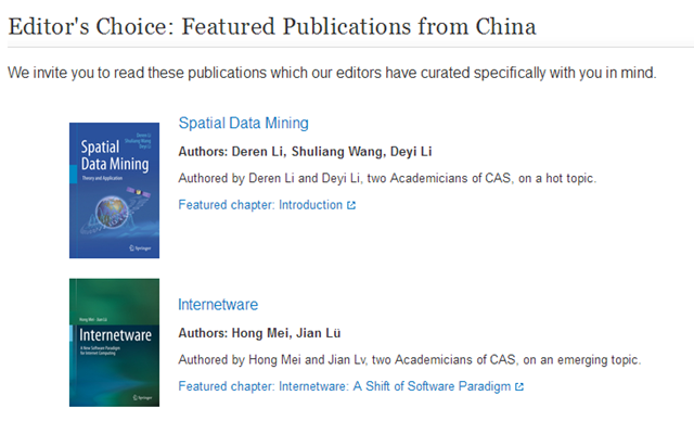 近日,全球领先的从事科研、教育和专业出版的机构Springer(施普林格)在与Nature(自然)合并为Springer Nature后,推出“聚焦中国科研”特辑,旨在让世界全面了解中国科研领域的最新学术研究及著作。由bb贝博艾弗森官方网站梅宏院士担任第一作者的著作《Internetware》(《网构软件》,同领域代表出版物排名第2)、王树良教授担任第二作者的著作《Spatial Data Mining》(《空间数据挖掘》,同领域代表出版物排名第1)入选该特辑中计算机科学高影响力著作。