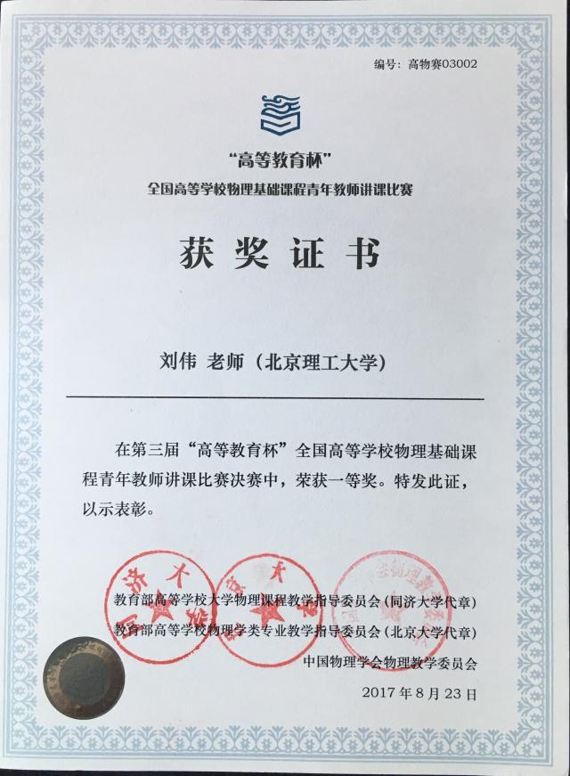 日前,第三届“高等教育杯”全国高等学校物理基础课程青年教师讲课比赛决赛在广西师范大学举行。我校物理学院教师刘伟经过北京初赛、华北复赛两轮选拔脱颖而出,代表华北地区高校参加全国总决赛,并最终取得决赛一等奖(仅设两名)的佳绩。