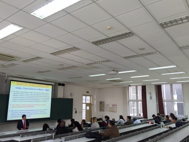 11月29日,金斗焕以“人类能够在月球和火星上生存”为专题进行了讲授,介绍了美国、俄国、中国、日本、印度和韩国对月球和火星的空间探索,《1979年月球协定》的内容以及探索月球或其他天体上自然资源的活动中所存在的法律问题。最后,金斗焕还指出建立ISA的必要性。讲座结束后,各位学生踊跃发言与金斗焕进行交流。