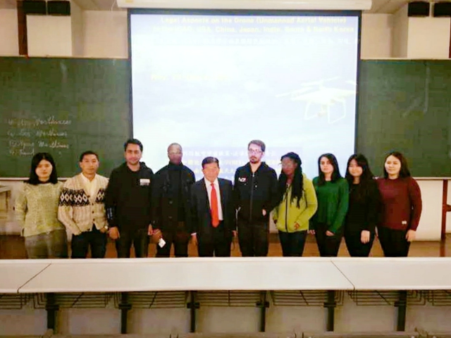 12月1日,金斗焕分别就“无人机的法律问题”和“中国、韩国、日本空间法的主要内容和法律问题”进行讲解。就“无人机的法律问题”,金斗焕首先介绍了无人机在美国、中国、日本、印度、韩国、朝鲜的发展状况以及法律规定,指出了无人机在灾难监测、快递业务等多方面的商业应用。并指出现阶段尚未制定关于无人机可视范围、禁止夜间飞行等的法律条法规。