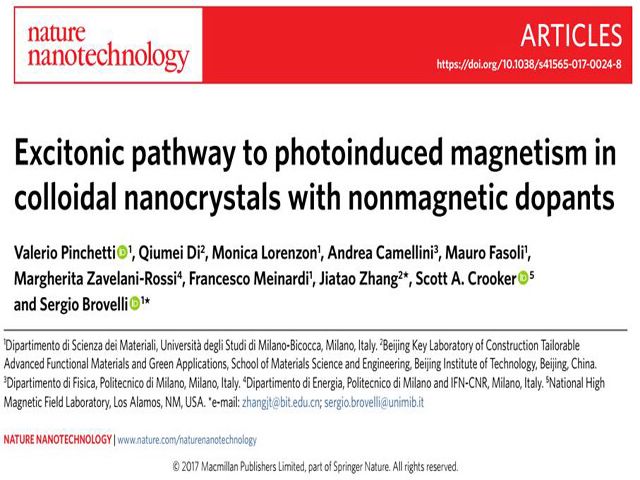 北京时间2017年12月18日,bb贝博张加涛教授与意大利米兰比可卡大学Sergio Brovelli教授合作(共同通讯作者)在国际纳米科技权威杂志《自然·纳米技术》在线发表了最新研究成果“Excitonic Pathway to Photoinduced Magnetism in Colloidal Nanocrystals with Nonmagnetic Dopants”。