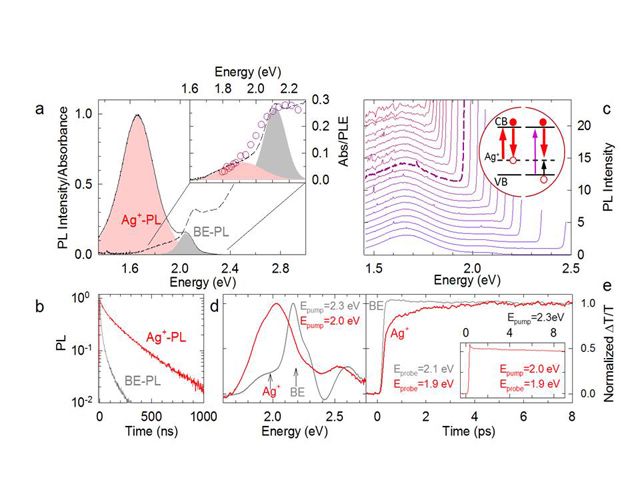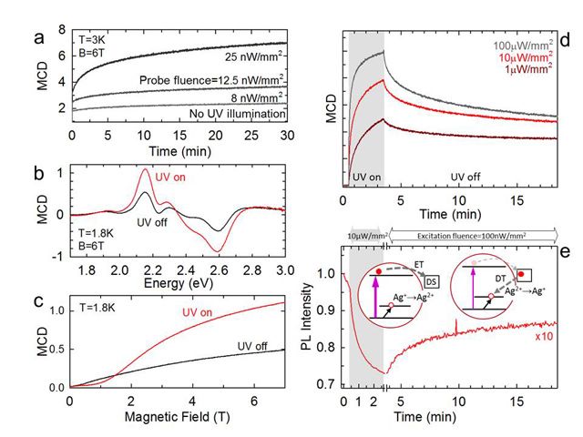 Ag+作为一类新兴掺杂元素,常用于III-V族和II-VI族半导体纳米材料中。Ag+的掺杂引入带间能级,并能够与主体导带形成光学耦合。因为其4d轨道全满,所以Ag+是非磁性的。掺杂引起的荧光归因于光激发的空穴转移到Ag+之后与导带电子的复合。这种光活化过程和Ag+电子构型的相关变化机理仍不清楚。基于此,bb贝博艾弗森官方网站张加涛教授课题组与意大利Brovelli教授课题组合作,全面系统的研究了Ag掺杂CdSe纳米晶的激发衰减过程。他们发现一个有趣现象,光生空穴的捕获致使Ag+转变成顺磁性的Ag2+。激子的复合过程与光诱导磁性有着不可分割的关系。他们观察到强烈的光活化磁性和半导体纳米材料的稀磁行为。这一研究结果表明通过非磁性杂质掺杂而诱导的激发过程可以获得光学可转换的磁性纳米半导体材料。实现其光、电、磁学性能有效调控,促进其在光电自旋器件的应用!