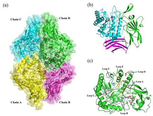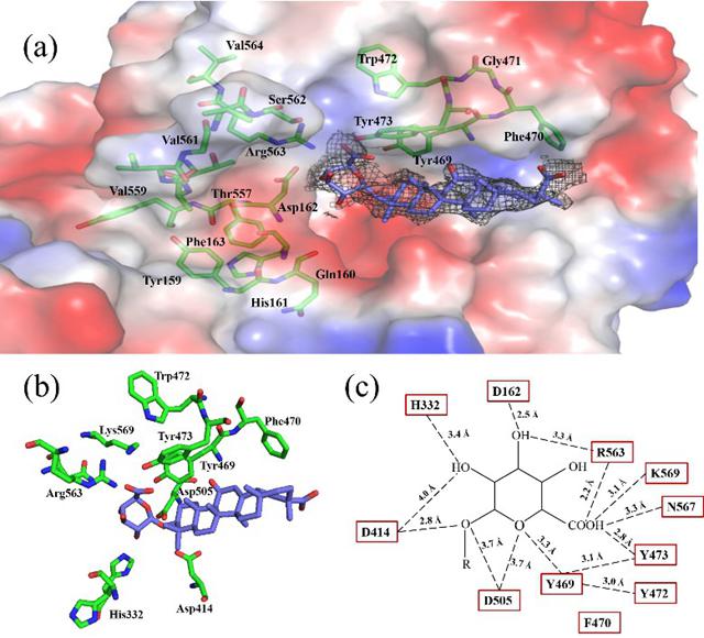 萜烯类糖苷化合物是一类重要的天然产物,因其具有重要的生物活性和药用价值被广泛地应用于医药、食品和精细化工等领域。相比化学合成糖苷存在立体选择性差、工艺复杂等问题,酶在催化合成糖苷过程中具有良好的立体选择性。β-葡萄糖醛酸苷酶(GUS)属于糖苷水解酶家族GH1,GH2和GH79家族,能特异性水解D-葡糖醛酸糖基与苷元之间的β-糖苷键,在代谢性疾病的诊断和药物开发中均有重要的应用。目前科学家已经发现并解析了来源于人和细菌的GUS酶的晶体结构(Science, 2010. 330(6005): 831-835; Nature Structural Biology, 1996. 3(4): 375-81),本课题组在国际上首次解析了来自真菌的β-葡萄糖醛酸苷酶的结构及其与天然底物的识别催化机制。