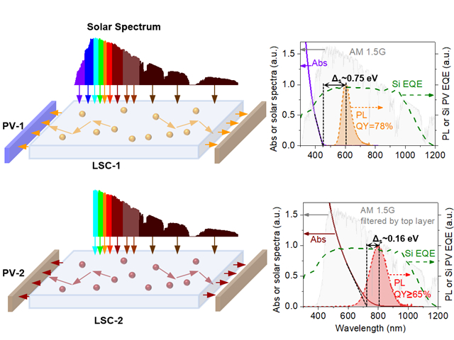 此研究论文基于涂布技术制备了叠层式的太阳能聚光器件,实现太阳能光谱的光子分级。该方法利用两种荧光量子点,一种是基于锰离子掺杂结构的量子点,该量子点可以吸收高能量紫外光和部分蓝光(440 nm),同时发出600 nm的荧光,另一种基于铜铟硒结构的量子点,该量子点可以吸收大部分的可见光,同时发出800 nm的荧光。该器件可以实现太阳能光谱中不同能量光子的分离,从而实现高效率的光伏输出(3.8%)。