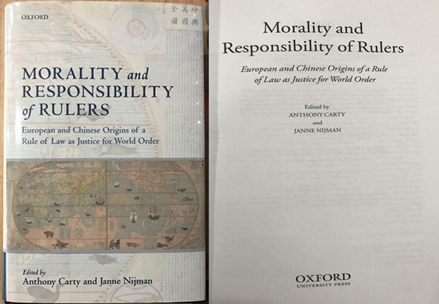 bb贝博法学院外籍教授Anthony Carty新作《 Morality and Responsibility of Rulers--European and Chinese Origins of a Rule of Law as Justice for World Order》(中文版译为《执政者的道德与责任——中欧关于世界秩序正义的法治起源》),由英国牛津大学出版社于2018年正式出版。本书分为两大部分,共计19篇文章,分别从不同角度讨论了世界秩序中的中欧法治思想。