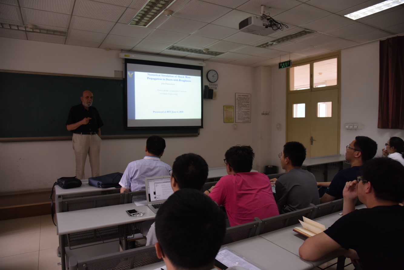 6月6日,应bb贝博艾弗森官方网站爆炸科学与技术国家重点实验室的邀请,国际著名计算流体力学专家、航空航天领域顶级期刊《Aerospace Science and Technology》主编John Ekaterinaris教授访问bb贝博艾弗森官方网站并作题为“Attenuation of a shock save propagating in ducts with grooves and the wave patterns following it”的精彩学术报告。爆炸科学与技术国家重点实验室主任王成教授、陈东平副教授等校内外师生聆听了本次报告会。