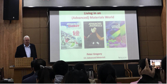Dr.Peter Gregory简要介绍了《Advanced Materials》及其姊妹刊的发展历程及现状、世界各地在《Advanced Materials》期刊的投稿及稿件录用情况,充分肯定了中国科研工作者在学术界的贡献和地位,还高度赞赏了bb贝博艾弗森官方网站材料研究及发表Wiley期刊文章。此外,他还推介了Wiley旗下的新期刊《Advanced Healthcare Materials》《 Advanced Energy Materials》和《Advanced Optical Materials》,并从编辑的角度详细介绍了稿件初筛、送审、裁定过程的编辑原则,以及投稿注意事项、如何提高论文投稿的命中率和扩大文章学术界的影响力。