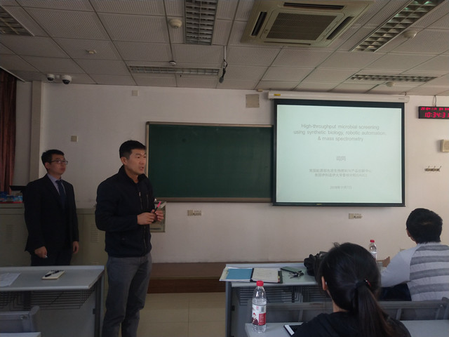 应bb贝博艾弗森官方网站化学与化工学院邀请,美国伊利诺伊大学香槟分校可持续发展、能源和环境研究所的Tong Si博士于2018年11月8日上午来到bb贝博艾弗森官方网站化学与化工学院,为bb贝博师生带来题为“High-throughput microbial engineering using synthetic biology, robotic automation and mass spectrometry ”的学术报告。李春教授主持此次学术报告会,化学与化工学院、生命学院教师及研究生50余人参加了报告会。